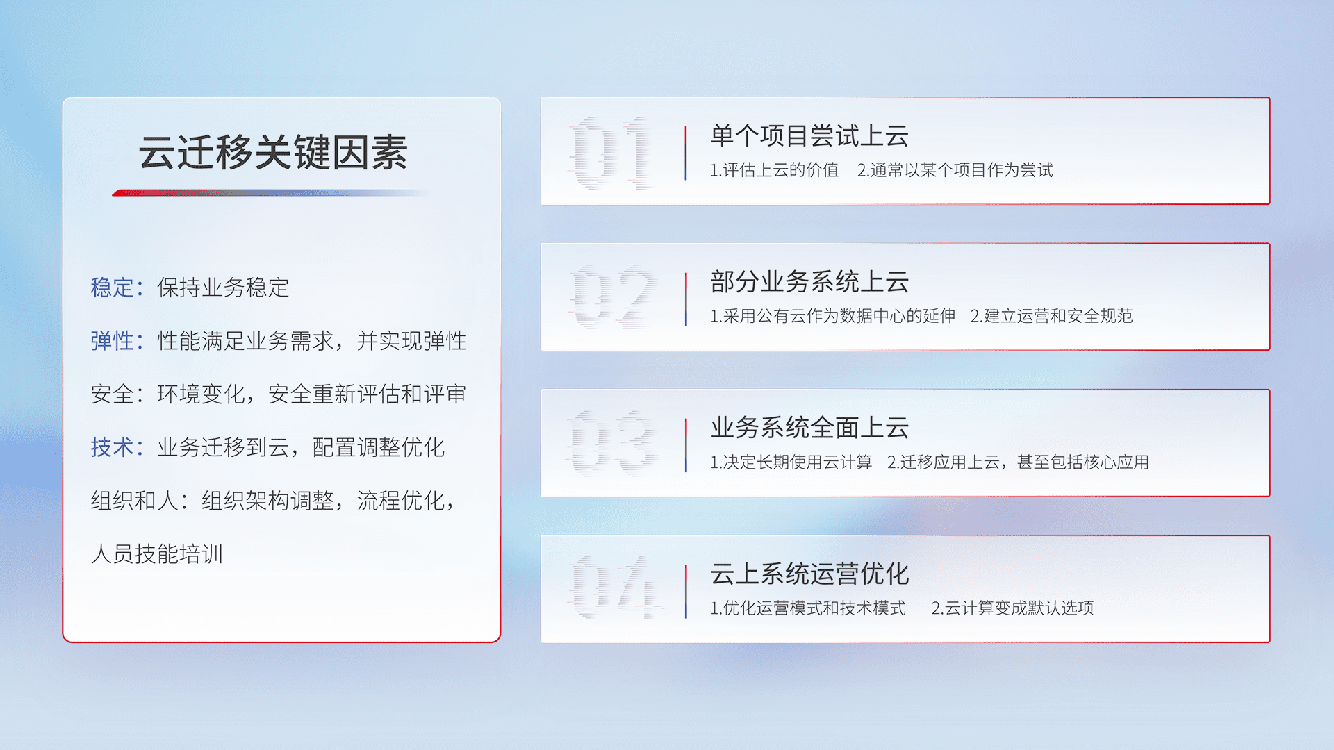 结合实际业务,,从规划设计、、、、云平台选型、、、、云原生改造、、、、数据迁移、、、集成交付,,,迁移全过程为客户识别最佳上云路径,,,,做好风险识别管理,,,设计网络架构、、、身份权限、、、、安全审计合规、、、、操作审计、、、日志审计、、监控告警策略、、多站点容灾设计等,,,,对云上基础设施进行整体规划,,,,提升IT治理水平,,,以满足弹性、、、、高可用、、、、高性能的需求。。。。