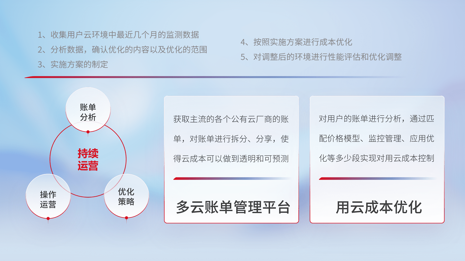 通过多云纳管,,,,以统一的资源数据模型把客户的云资源进行抽象和封装,,进而实现对多云资源的统一操作,,保障云资源管理的可靠性、、、稳定性与可用性。。量身定制化运维内容,,,,配置、、开发运维、、补丁管理、、备份、、监控、、、、认证和访问管理、、、审计和日常巡检等,,,,保障在用云过程中的可靠度,,稳定度以及高可用率。。